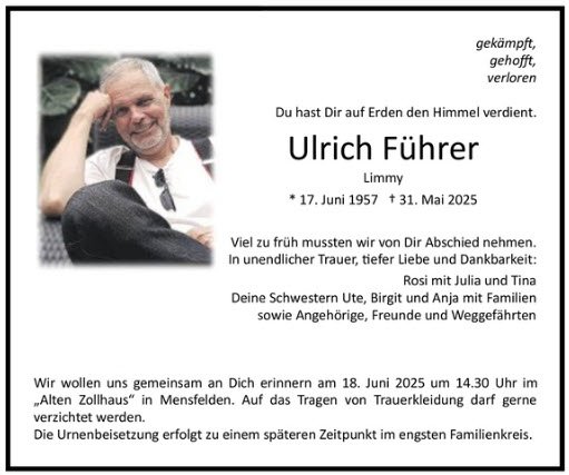In dieser schweren Zeit wünsche ich euch viel Kraft. Möge euch der Gedanke trösten, dass Ulrich nicht nur in euren Herzen weiterlebt, sondern auch in den Erinnerungen vieler, die mit ihm unterwegs sein durften.